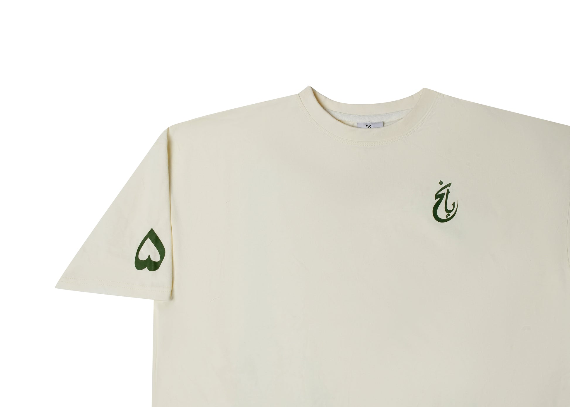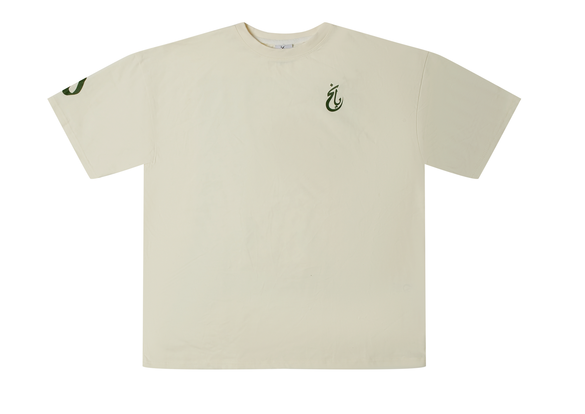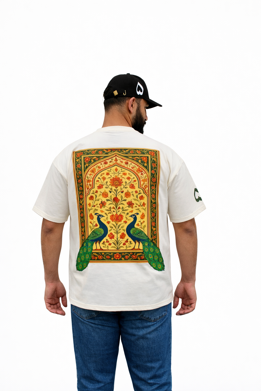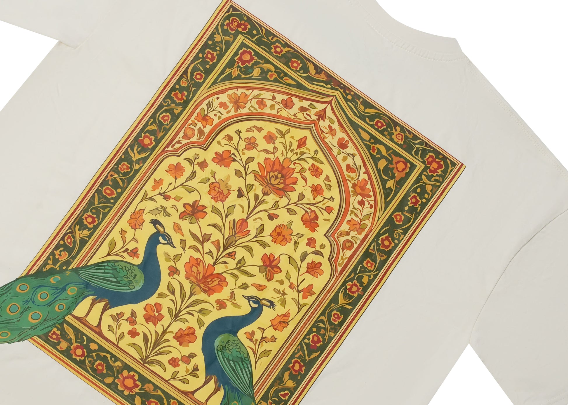 This off-white tee features a detailed back print inspired by traditional Mughal architecture and textile design. The central panel highlights blooming florals framed by an ornate arch, with two peacocks completing the artwork. A modern silhouette meets classic heritage elements